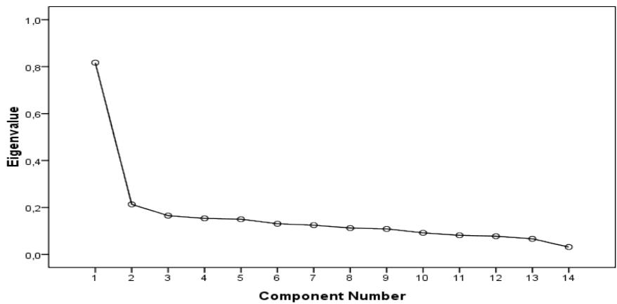 Principal Component Analysis (PCA) is a statistical technique for multi-varied verification that was utilized for an exploratory reading of the responses. The conclusion based on the graphical analysis of Figure 1 is that, as the first factor appears highlighted, the instrument is unidimensional, that is, the 14 items related to violence measure a single construct which, in this case, is how exposed someone is to violence. It is a declivity diagram, plotted with the aid of the SPSS computer program, with the number of factorial components extracted.