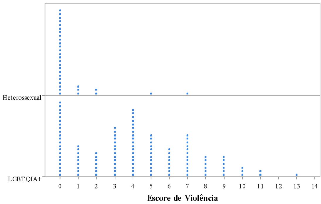 It was concluded that, in the sample, 94.9 percent of heterosexuals have a score of violence between 0 and 2, that is, they say they have suffered no more than two aggressions or discriminations among those listed in the survey, and 79.7 percent in this group show a null score. Among LGBTQIA+, the situation is different, as 31.2 percent have a violence score between 0 and 2, and only 17.5 percent have a null score, that is, they have suffered no violence at all. Figure 3 shows graphically the concentration of lower scores for the heterosexual population.