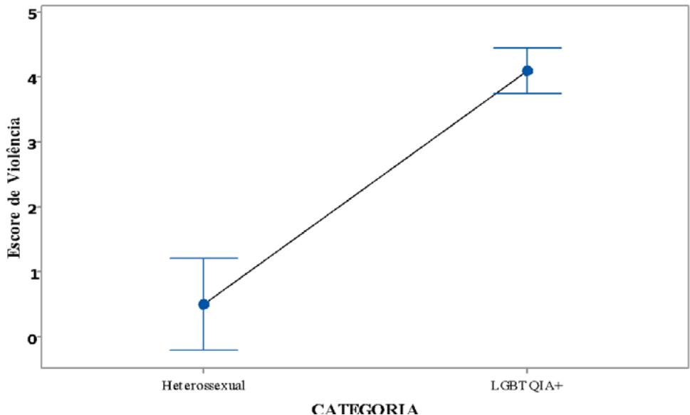 One-Way Anova test, with $95\%$ of reliability, applied generally in relation to sexuality, yields to a RI for the heterosexuals equal to (-0.214; 1.197) and for the LGBTQIA+ population to (3.731; 4.440), with p-value=0,000, that is, the null assumption is rejected, once the violence's score perceived by the LGBTQIA+ population is higher than for heterosexuals. This difference can be easily watched in the graphical representation shown in Figure 4.