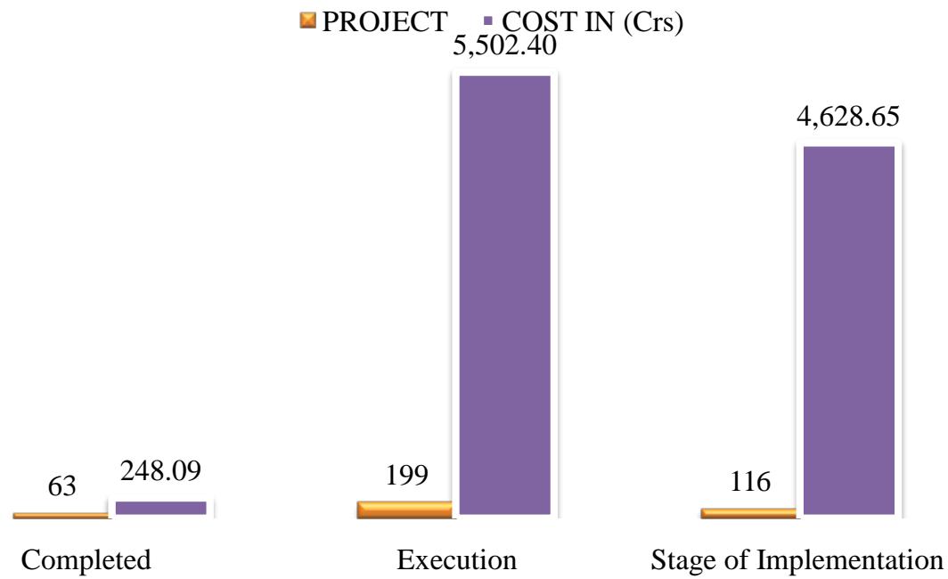 <table><tr><td>S.NO.</td><td>PROJECT</td><td>COST IN (Crs)</td><td>STATUS</td></tr><tr><td>1.</td><td>63</td><td>248.09</td><td>Completed</td></tr><tr><td>2.</td><td>199</td><td>5,502.40</td><td>Execution</td></tr><tr><td>3.</td><td>116</td><td>4,628.65</td><td>Various stages of Implementation</td></tr><tr><td>Total</td><td>378</td><td>10,379.14</td><td></td></tr></table>