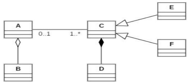 Aggregation $\rightarrow$ An aggregation is represented as an association with a white diamond on one end, where the class at the diamond end is the aggregate (container class). It includes or owns instances of the class (contained class) at the other end of the association [4](e.g., the relationship between class A and B in fig. 1).