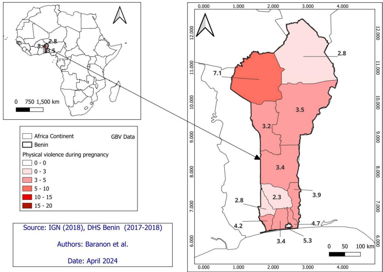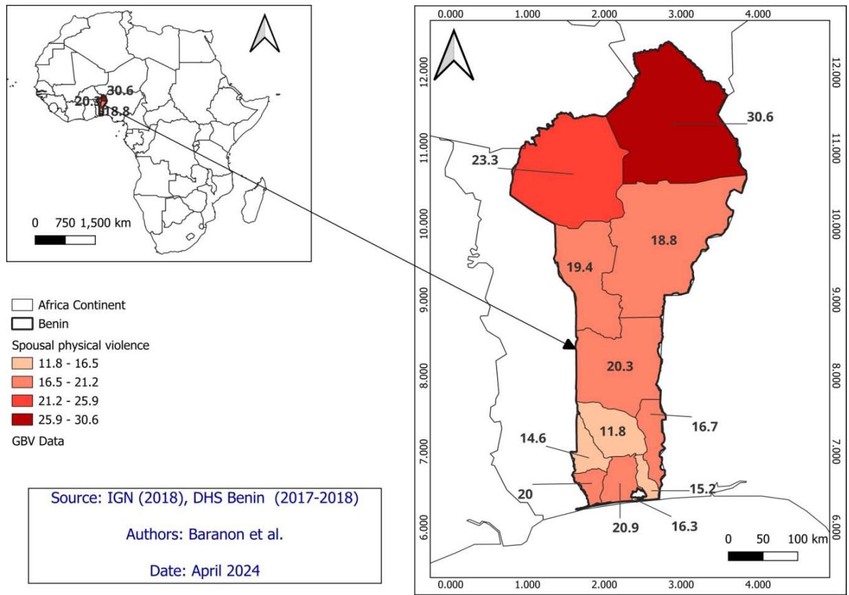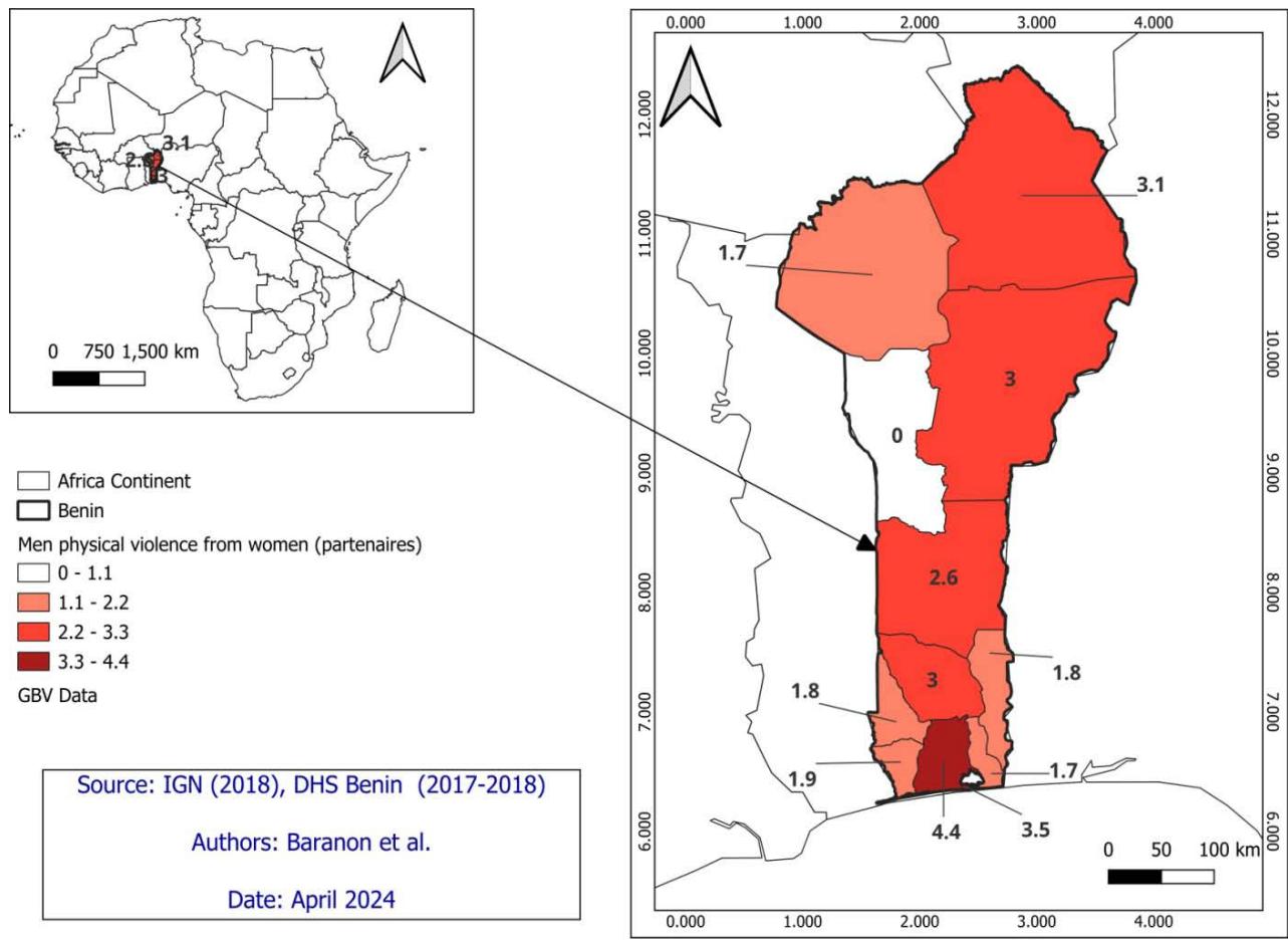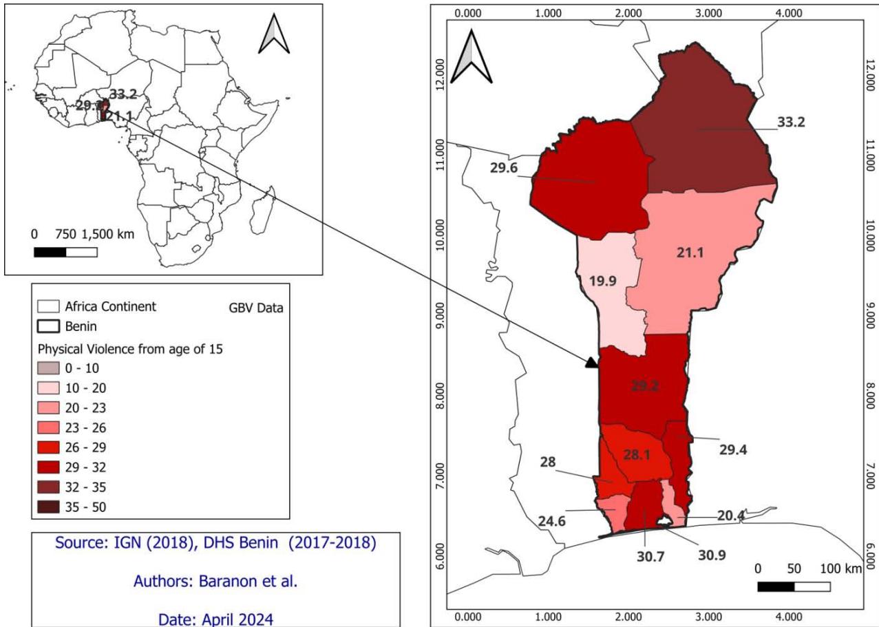 In light of these considerations, conducting a spatial analysis of GBV in Benin is imperative. Such analysis can inform evidence-based interventions tailored to specific geographic contexts, empower local communities, and contribute to the broader goal of promoting gender equality and ending violence against women and girls in Benin. Therefore, there is a pressing need to employ spatial analysis techniques, such as Geographic Information Systems (GIS) and spatial statistics, to systematically examine the spatial distribution of GBV incidents and identify high-risk areas. Using Demographic and Health Survey (DHS) data, the objectives of this study are: to compute the GBV indicators by regional area in Benin; to map the spatial distribution of GBV incidents using GIS; and to analyze the spatial disparities.