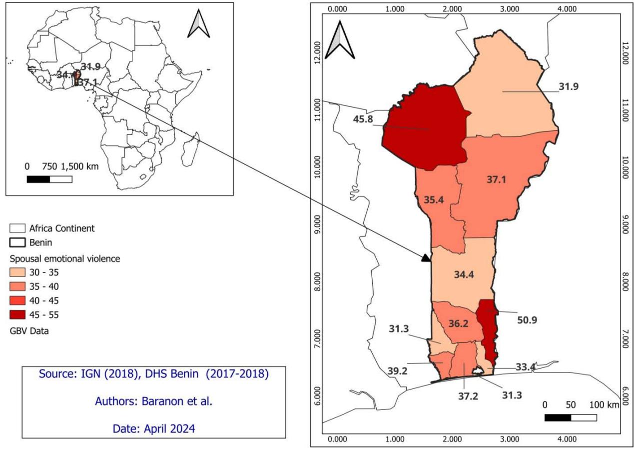 The analysis of data from the fifth Demographic and Health Survey of Benin (DHSB-V) offers a comprehensive examination of gender-based violence among women aged from 15 to 49 across different departments in Benin. The study highlights a range of critical findings regarding emotional, physical, and sexual violence, as well as the controlling behaviors exerted by partners in intimate relationships. The prevalence of violence varies significantly across departments, revealing patterns of concern and regional disparities.
