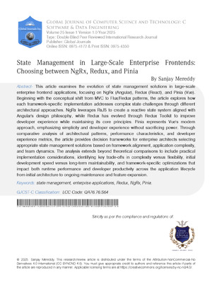 This article examines the evolution of state management solutions in large-scale enterprise frontend applications, focusing on NgRx (Angular), Redux (React), and Pinia (Vue). Beginning with the conceptual shift from MVC to Flux/Redux patterns, the article explores how each framework-specific implementation addresses complex state challenges through different architectural approaches. NgRx leverages RxJS to create a reactive state system aligned with Angular’s design philosophy, while Redux has evolved through Redux Toolkit to improve developer experience while maintaining its core principles. Pinia represents Vue’s modern approach, emphasizing simplicity and developer experience without sacrificing power. Through comparative analysis of architectural patterns, performance characteristics, and developer experience metrics, the article provides decision frameworks for enterprise architects selecting appropriate state management solutions based on framework alignment, application complexity, and team dynamics. The analysis extends beyond theoretical comparisons to include practical implementation considerations, identifying key trade-offs in complexity versus flexibility, initial development speed versus long-term maintainability, and framework-specific optimizations that impact both runtime performance and developer productivity across the application lifecycle from initial architecture to ongoing maintenance and feature expansion.
