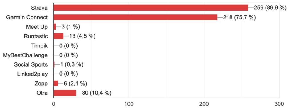 La plataforma reina en el mundo del deporte digital también se destacó en la encuesta como la más aceptada y difundida, compartiendo protagonismo con un Garmin Connect que sin embargo es compatible con la primera al prácticamente funcionar siempre como sincronizadas. Los deportistas registran sus prácticas deportivas a través de los relojes Garmin, que ya cuenta con una APP que permite el estudio y análisis de los datos. Sin embargo, consiente la sincronización con Strava (al igual que otras plataformas como Bkool), por lo que los datos pasan automáticamente a esta, permitiendo ahí la interacción social de la comunidad.