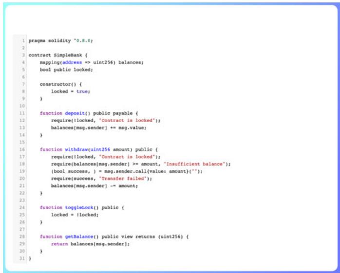 In this simplified bank smart contract, users can deposit and withdraw Ether from their accounts. The contract also has a function called 'toggleLock', which allows the contract owner to lock or unlock the contract to prevent further deposits and withdrawals.