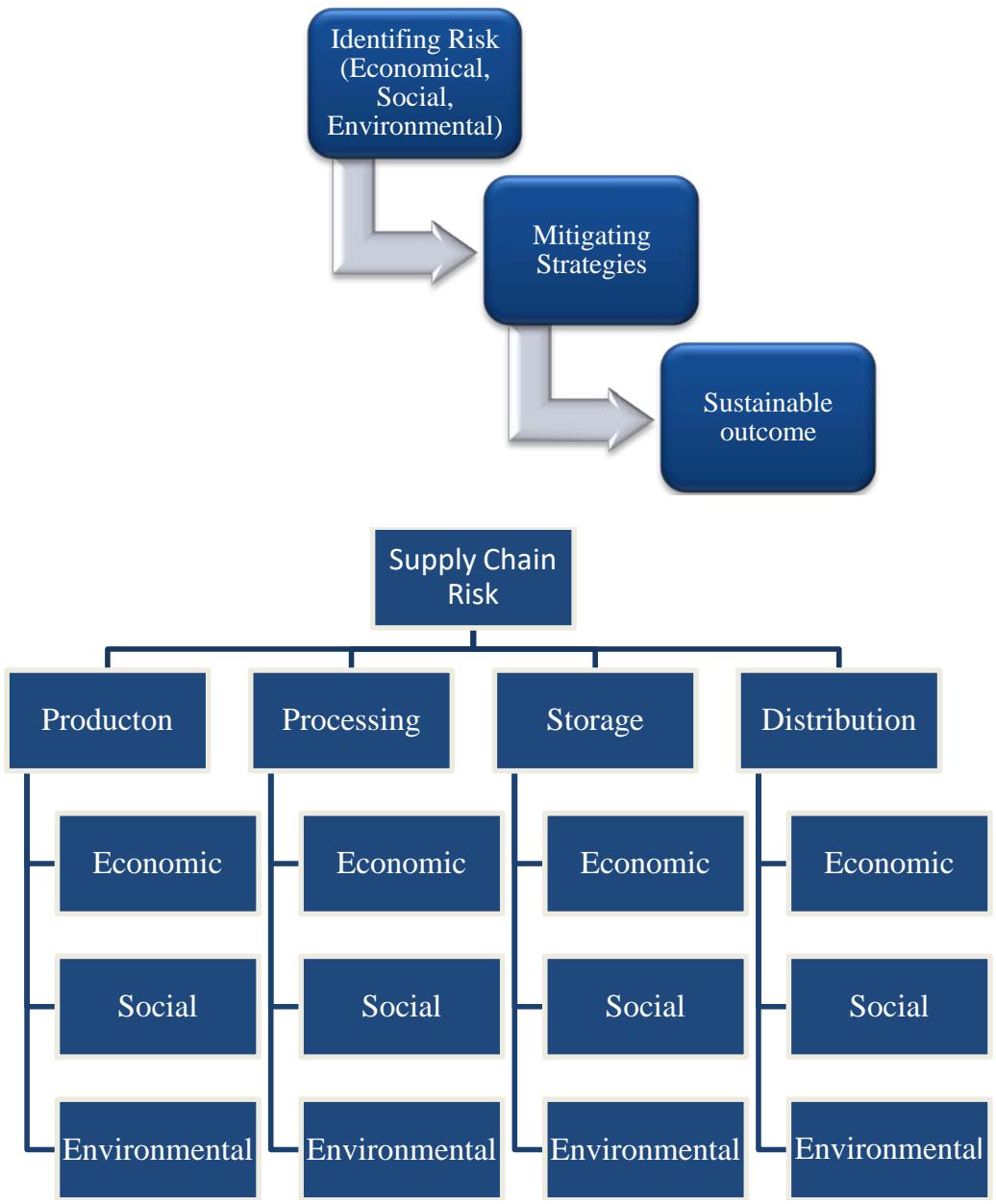 The resource-based view and previous research are the sources of the supply chain risk management model that this study offers (Figure 1). This model links risks at the production, storage, processing, and distribution stages to social, economic, and environmental factors by evaluating them through the lens of sustainability. The study presents a theoretical framework based on sustainability and contingency theories, enabling the classification of different risk factors in the poultry supply chain. The study also uses content analysis to identify practical risk mitigation techniques, significantly advancing our theoretical knowledge of risk management in poultry supply chains. Because of the external pressures from different stakeholders to incorporate sustainable elements into supply chain practices, implementing sustainability in supply chain management is a complex task. The present circumstances, influenced by the organization's scale, technological advancements, and environmental unpredictability, determine the risks connected to the poultry supply Chain. Regarding livelihoods,