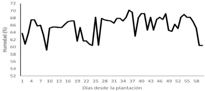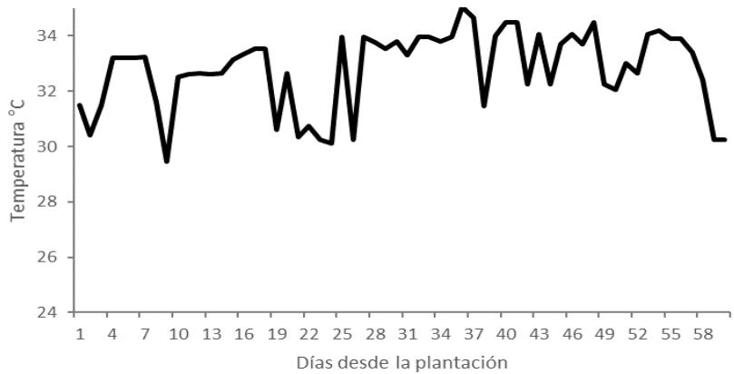 Las medicaciones de temperatura (Figura 8) y humedad relativa (Figura 9) realizadas in situ en el vivo arrojaron valores de 30 a $35^{\circ}C$ y de 58 a $69\%$ respectfully durante los 58 días del muestreo. Según el situo http://es.climate-data.org/america-del-norte/cuba/ciego-de-avila/cayo-coco-57554/ en Cayo Coco para el mes de agosto se registraron valores de temperatura minima de $27.1^{\circ}C$ y para la maxima valores de $29.3^{\circ}\mathrm{C}$, registrandose una temperatura media de $28.2^{\circ}\mathrm{C}$. Para el mes de septiembre la temperatura minima fue de $26.7^{\circ}\mathrm{C}$ y la maxima de $29^{\circ}\mathrm{C}$ para una media de 27.8. Estos values differen de los obtenidos en el microvivero, contradicciónatabuida a la distancia existente entre el situ de propaganda y el situ de establishimiento (más de 62 km) y al equipo de medicaciónutilrado.