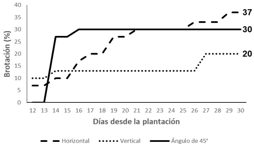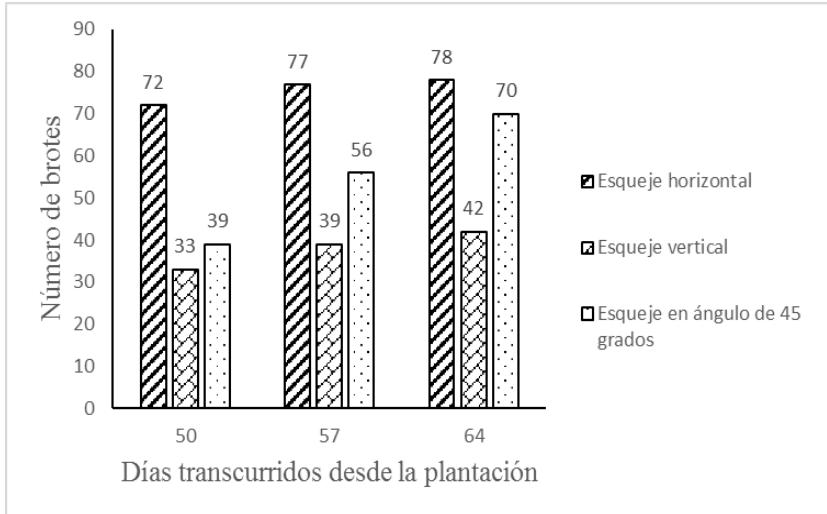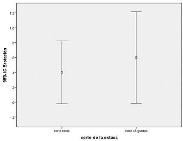 El ángulo formado al realizar el corte en el extremo del segmento del estolón no influyó en el comportimiento de la brotación (Figura 6). En este sentido Ponce et al., 2014 alegan que una las conditiones que garantiza el exito de la propaganda por estasas es la realización del corte transversal para que haya mayor area de producción de raíces. Por su parte Gómez, 2016 para el cultivo de caña de azúcar VARIODAD CG98-10, propone que el corte de los tallos debe realizarse de forma vertical de manière que quede redondo.