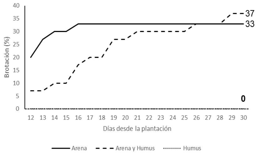 Al analizar el percentaje de brotacion de los segmentos estoloniferos segun el tipo de sustrato realizado (Figura 3.), ellos comenzaron a emerger a partir de los 12 días de ser plantados y alcanzaron un percentaje similar. Los segmentos plantados en humus de lombriz no brotaron.