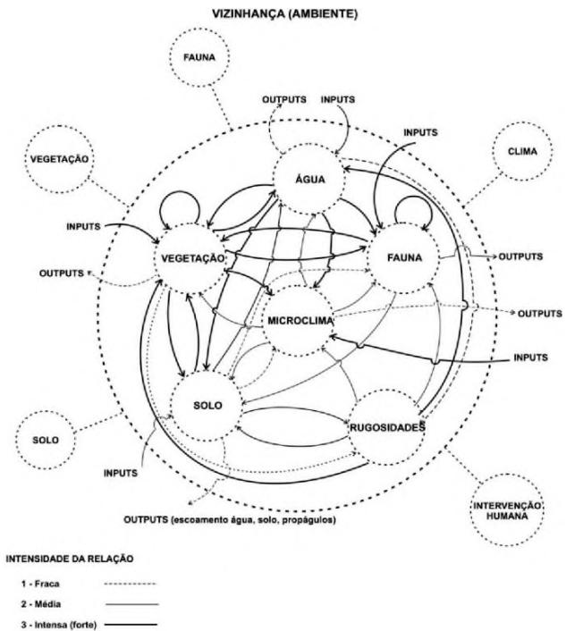 Partindo da análise da matriz, pode-se estruturar a concepção do modelo do sistema ecológico para recuperação da área degradada, evidenciando graficamente as principais relações e intensidades, existentes entre os subsistemas que o compõem (Figura 2).