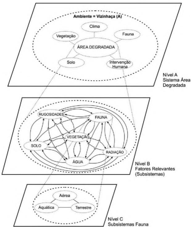 Figure 1: Simplified diagram of the system with degraded components of the environment (level A). At level Bare represented elements (subsystems) of the degraded area and level C are represented constituents in the fauna Figura 1: Diagrama simplificado do sistema degradado com os componentes do ambiente (nível A). No nível B estão representados os elementos (subsistemas) da área degradada e no nível C estão representadosos componentes do subsistema da fauna a intensidade das relações entre os componentes do sistema e o ambiente, optou-se por aplicar quatro graus de intensidade, variando de 0 a 3, que representam: $0 = \mathtt { a }$ intensidade da relação é nula; $\texttt { 1 } = \mathtt { a }$ intensidade da relação é fraca; $2 = \mathtt { a }$ intensidade da relação é média; e $\begin{array} { r l r l } { { 3 } } & { { } = } & { { } a } \end{array}$ intensidade da relação é intensa (forte).