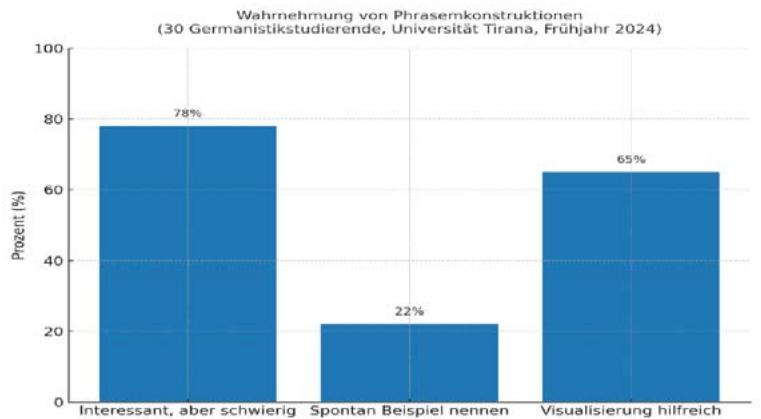 Die empirische Pilotstudie an der Universität Tirana hat verdeutlicht, dass Lernende Phrasemkonstruktionen bereits als charakteristisch und interressant wahrnehmen, zugleich jedoch Unsicherheit bei denen Produkter Anwendung empfinden. Besonderss betont wurde der Bedarf an visueller Unterstützung sowie an gezielten Materialien, die über traditionelle Grammatik- und Übersetzungssansätze hinausgehen. Diese Befunde unterstreichen, dass die Integration von Phrasemkonstruktionen in den DaFUnterricht nicht nur wünschenswert, sondern notwendig ist, um den Lernenden ein realitätsnahes, idiomatisches und kulturell reflektiertes Sprachhandeln zu ermögenlich.
