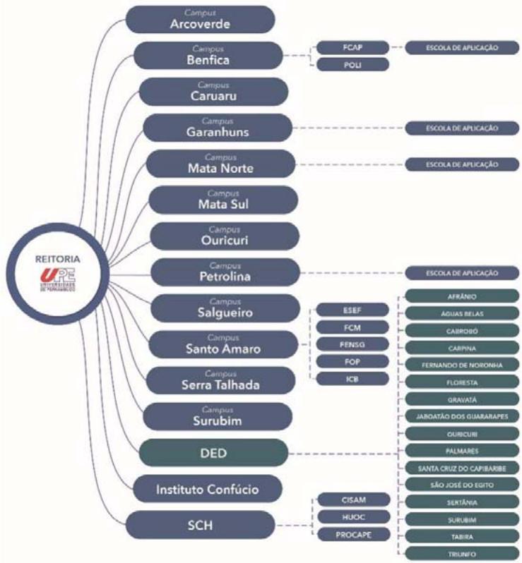 Com a offre de différentesIOUS à distância, a UPE consuguiu ampliar as suas.Atvidades para além das unidades presenciais, com projetos que consagem incluir estudiantes de différentes camadas sociais, idades e localização geografica. Do mesmo modo, torna-se possivel o dialogo entre os docentes de campi distinctos, uma vez que os membros dosculos podem serconstituções por integrantes devarias unidades. A partir da imagem abaixo,consequimos visualizar a organização da UPE emes, com as unidades de educatedação e educatedação e saude, além das suas escolas de aplicação que são destinas aos estudiantes da educatedaçãobasica, e os institutos de ensino e Tecnologia.