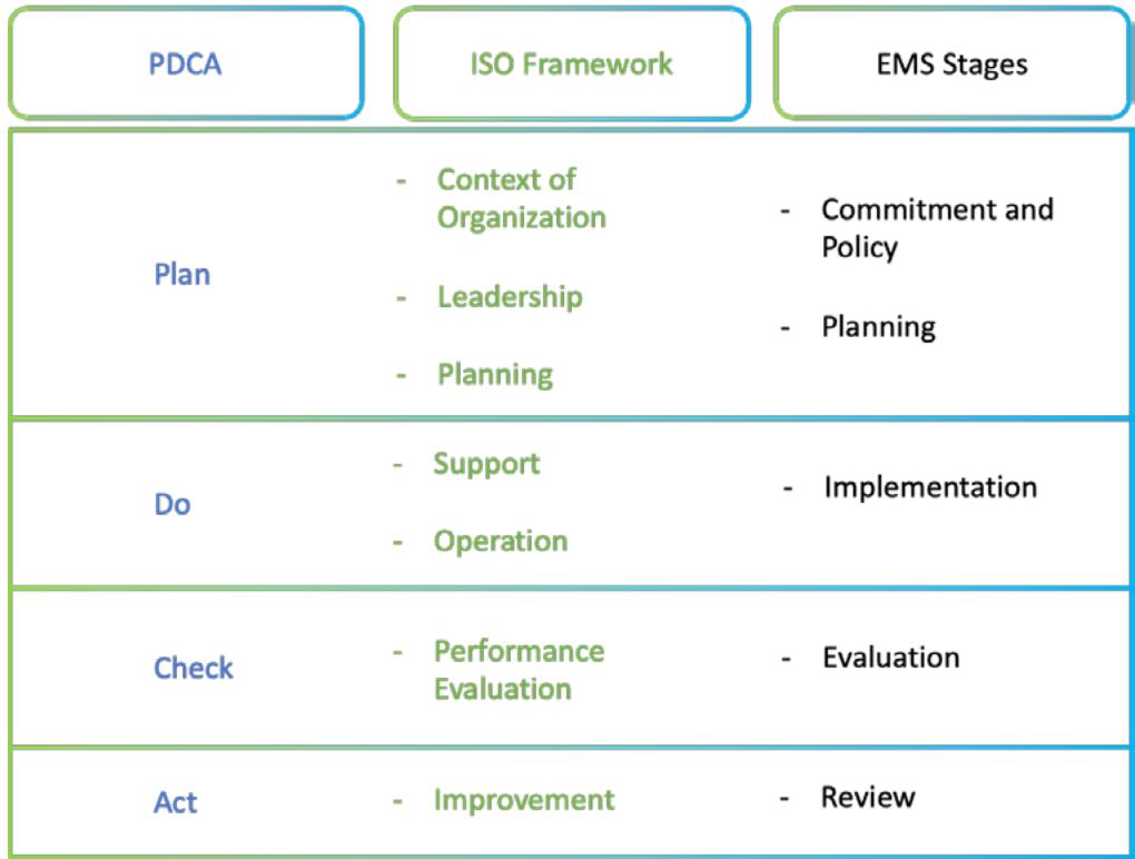 Figure 4: Link Between PDCA, ISO 14001 Framework, and EMS Five Steps