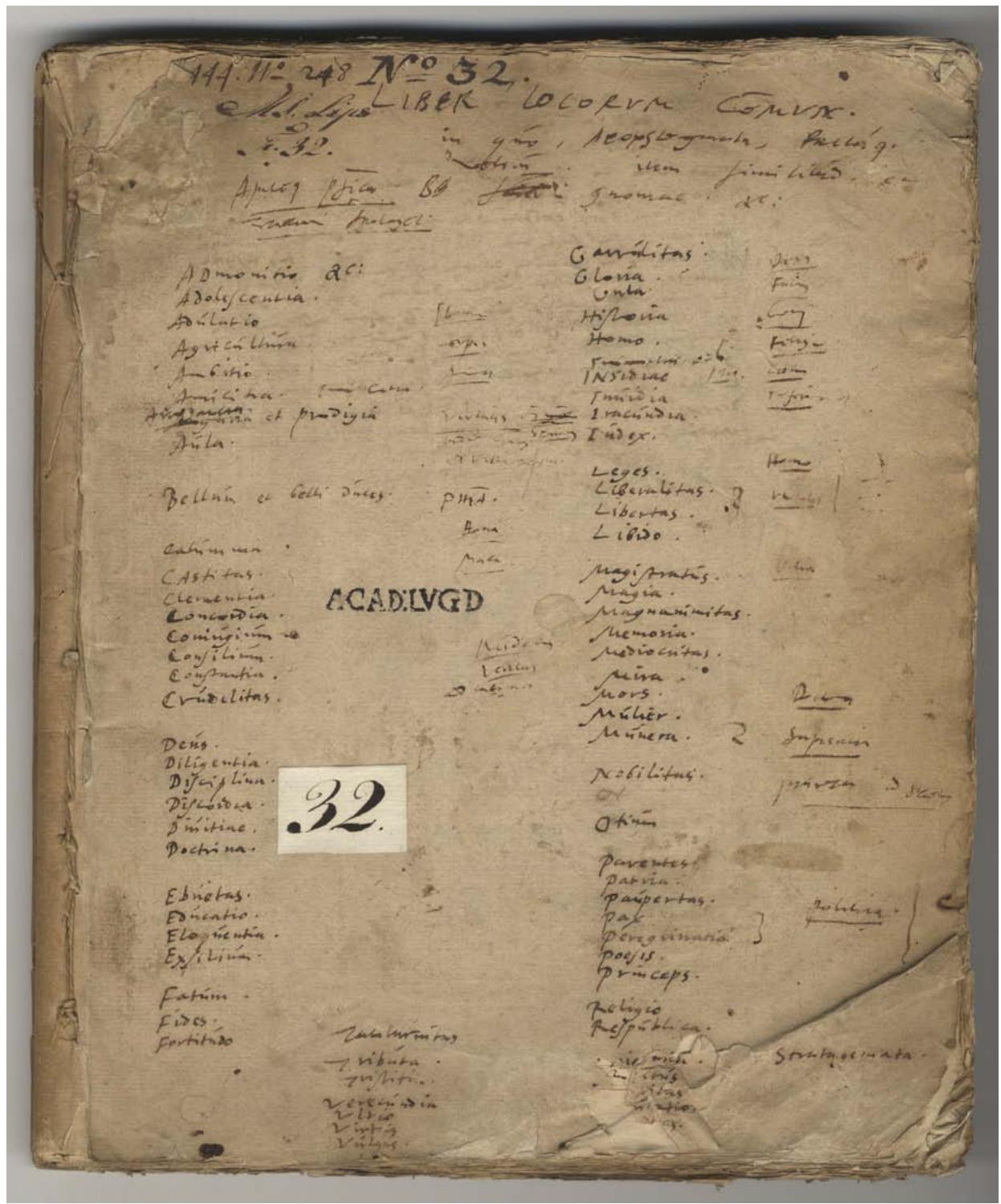 Manus. Lips. No. 248) fol. Justi Lipsii Liber Librorum communium, apothegmata ex ordine alaphabetico autographa. Ms. Lips. 32 is a general notebook of commonplaces, carefully organised in advance: a selection of keywords and topics (libertas, Patria, Pax, Princeps et Pricipatus, Respublicica, leges, libertas et servitus, etc.).