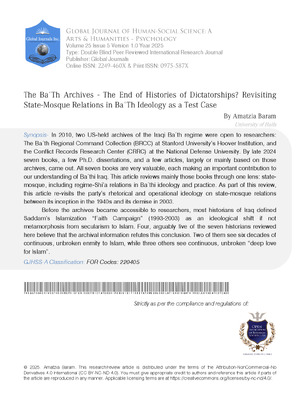 Dr. Amatzia Baram. 2026. \u201cThe BaTh Archives – The End of Histories of Dictatorships Revisiting State-Mosque Relations in BaTh Ideology as a Test Case\u201d. Global Journal of Human-Social Science - A: Arts & Humanities GJHSS-A Volume 25 (GJHSS Volume 25 Issue A5).