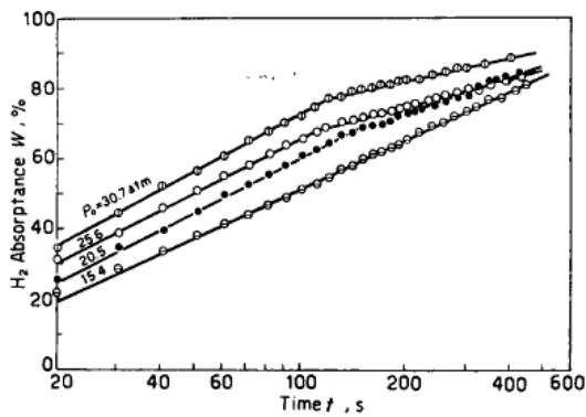 Lu Manqi, Qi Zhenzhong and Wu Pingsen [9] reported the kinetic curve of hydrogen absorption by LaNi5. Figure 6 shows the curve of hydrogen absorption with time when absorbing hydrogen at different temperatures under the same initial pressure. Figure 7 shows the relationship between hydrogen absorption capacity and time at the same hydrogen absorption temperature and different initial pressure. Obviously, on the diagram, each curve consists of two straight lines with different slopes. The straight line corresponding to the part with high hydrogen absorption capacity has a smaller slope. With the increase of temperature or the decrease of initial pressure, the slope difference between the two parts of each curve is so small that it is very close.