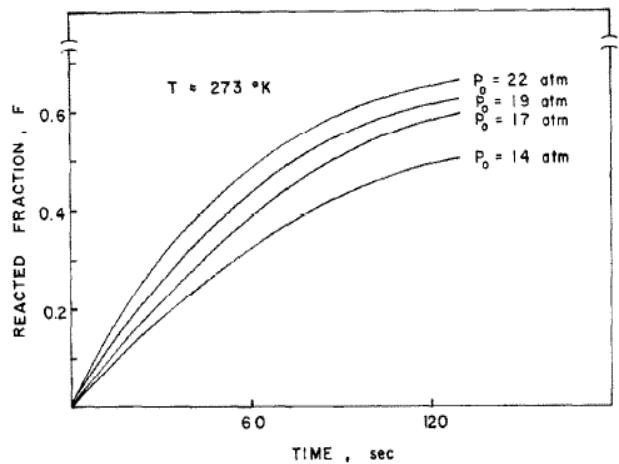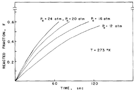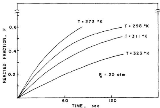 F = 5.0 \times 10^{-2} \frac{P_{0} - P_{eq}}{T^{1/2}} \exp\left(- \frac{1000\,\mathrm{cal/mol}}{RT}\right) t \quad F < 0.2 \tag{3}