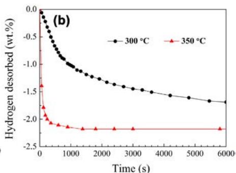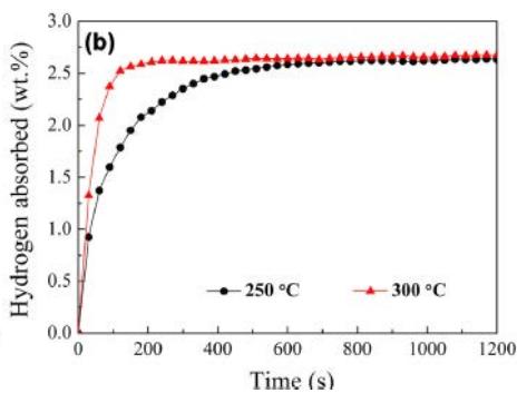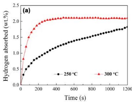 Wu, Li and Zhang[14] reported that the kinetic curve of hydrogen absorption of undoped, Y-doped and Ni-doped $\mathrm{Mg}_2\mathrm{Cu}$ alloy under 4Mpa pressure is shown in figure 12. it can be seen that the hydrogen absorption rate of undoped samples becomes faster when the hydrogenation temperature is increased to $300^{\circ}\mathrm{C}$, and the full hydrogen absorption energy is completed in 5 minutes, as shown in figure 12 (a). For Y-doped and Ni-doped samples, the full hydrogen absorption is completed in 10 minutes and $300^{\circ}\mathrm{C}2$ minutes, as shown in figure 12 (b). This means that both nanostructured $\mathrm{Mg}_{2}\mathrm{Cu}$ alloy and $\mathrm{YH}_{2} / \mathrm{YH}_{3}$ embedded in $\mathrm{Mg}_{2}\mathrm{Cu}$ matrix have good catalytic effect on $\mathrm{Mg}_{2}\mathrm{Cu}$ disequilibrium reaction.
