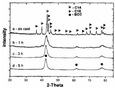 mixture of C14 and C15. It changes to BCC cubic structure after different time of ball milling, and all of them are meta-BCC after 5 hours of ball milling.