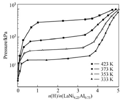 Figure 8 shows the hydrogen absorption P-C isothermal curve (P-C-T) of $\mathrm{LaNi}_{4.25}\mathrm{Al}_{0.75}$ alloy after initial activation at $333\mathrm{k}$, $353\mathrm{K}$, $373\mathrm{K}$ and $423\mathrm{K}$, the hydrogen storage capacity of the alloy decreases systematically, and the hydrogen absorption plateau pressure increases obviously with the increase of temperature. The relation function between platform pressure $(p_{eq})$ and temperature is In $p_{eq} = -4820 / T + 12.46$. At $353\mathrm{k}$ is the molecular formula of saturated hydride $\mathrm{LaNi}_{4.25}\mathrm{Al}_{0.75}\mathrm{H}_{4.2}$. Compared with $\mathrm{LaNi}_5\mathrm{H}_6$, the saturated hydrogen absorption capacity of $\mathrm{LaNi}_{4.25}\mathrm{Al}_{0.75}$ is reduced by nearly $30\%$, and the platform pressure is also significantly reduced.