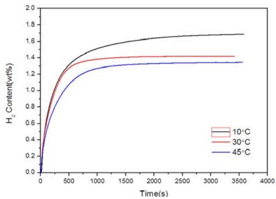 750s, $30^{\circ}\mathrm{C}$ 250s and $45^{\circ}\mathrm{C}350\mathrm{s},$ respectively. The incubation period of hydrogen absorption is obviously short, and the dissolution reaction time reaching the saturation point is less than a few minutes. $10^{\circ}\mathrm{C}$ reached a higher capacity, on the contrary, the hydrogen absorption function was relatively low in $45^{\circ}\mathrm{C},$ while the reaction rate was the fastest in $30^{\circ}\mathrm{C},$ reaching the equilibrium point very quickly.