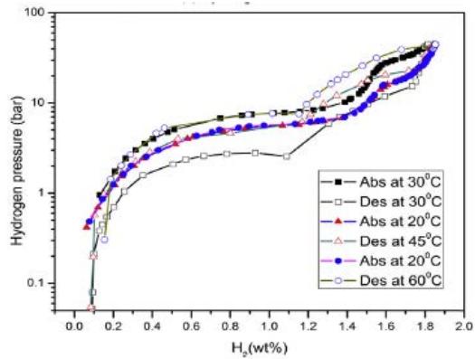 Fig. 8: PC isotherm curve of hydrogen absorption of LaNi4.25Al0.75 alloy at different initial activation temperatures.