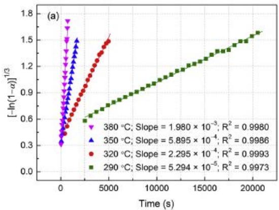 Here, $\alpha$ is the reaction fraction, $k$ is the rate constant and $n$ is the reaction order. According to the fitting results, the $n$ value of the hydrogen evolution reaction is taken as 3. Figure 11(a) shows that the hydrogen kinetics $[- \ln (1 - \alpha)]^{1 / 3}$ is plotted to t at different temperatures. It is clear that there is a good linear relationship between $[- \ln (1 - \alpha)]^{1 / 3}$ and reaction time. This shows that $\mathrm{Mg}_{88}\mathrm{Y}_{12}$ dehydrogenation follows a three-dimensional growth process controlled by the interface and nucleation at the same time.