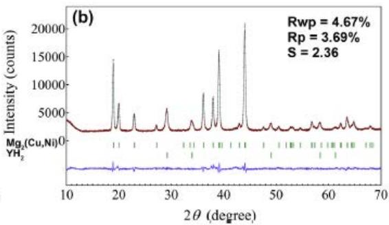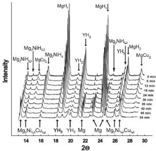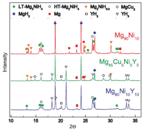 For Mg-Cu alloy doped with Y and Ni and Mg-Ni alloy doped with Y and Cu, except for $\mathrm{MgH}_2$, $\mathrm{YH}_2$ and $\mathrm{YH}_3$, $\mathrm{Mg}_2\mathrm{NiH}_4$ alloy hydride appears to be an exception.