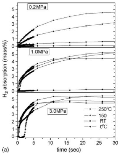 Fig. 14 shows the hydrogen absorption curve of Mg hydrogen storage alloy catalyzed by $1\mathrm{mol}\% \mathrm{Nb}_2\mathrm{O}_5$ [15]. At lower hydrogen pressure (0.2Mpa), the initial hydrogen absorption rate and saturated hydrogen absorption capacity increase with the increase of temperature. However, when the hydrogen pressure is 1.0Mpa, the initial hydrogen absorption rate and hydrogen absorption capacity of $250^{\circ}\mathrm{C}$ are lower than that of $150^{\circ}\mathrm{C}$ (before 30 seconds), and when the hydrogen pressure is 3.0Mpa, there is a cross scenario. The initial hydrogen absorption rate (before 30 seconds) is lower than that of $150^{\circ}\mathrm{C}$. The cross scenario occurs when the hydrogen pressure is in 3.0Mpa.