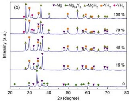 (a) undoped Mg2Cu sample (b) Y, Ni doped sample and $1.93\%$ hydrogen respectively within 3 minutes, indicating that the $\mathrm{Mg}_2\mathrm{Cu}$ samples doped with Y and Ni have better hydrogen desorption kinetics than the undoped samples. As mentioned above, $\mathrm{MgCu}_2$ and $\mathrm{MgH}_2$ exist together with $\mathrm{Mg}_2\mathrm{NiH}_4$, $\mathrm{YH}_2$ and $\mathrm{YH}_3$ in the hydrogenated, Y-doped and Ni-doped $\mathrm{MgCu}_2$ samples, so the nanostructured $\mathrm{Mg}_{2}\mathrm{NiH}_{4}$ and $\mathrm{YH}_{2} / \mathrm{YH}_{3}$ also have catalytic effects on the reverse reaction.