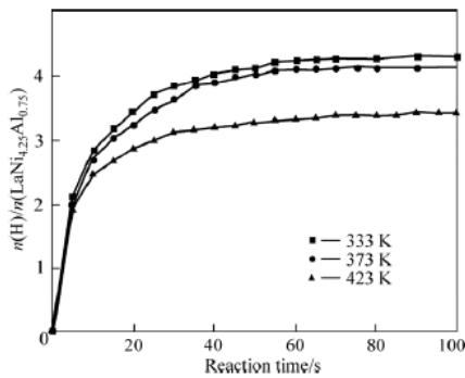 The kinetic curve of hydrogen absorption of $\mathrm{LaNi_{4.25}Al_{0.75}}$ alloy after 25 cycles of $1020\mathrm{kPa}$ (initial pressure of hydrogen absorption vessel) is shown in figure 9. At 333k and 373K 60 seconds, one mole of $\mathrm{LaNi_{4.25}Al_{0.75}}$ can absorb more than 4 moles of $\mathsf{H}_2$, but only 3 moles of $\mathsf{H}_2$ in 423K100 seconds. The hydrogen absorption rate decreases with the increase of temperature.