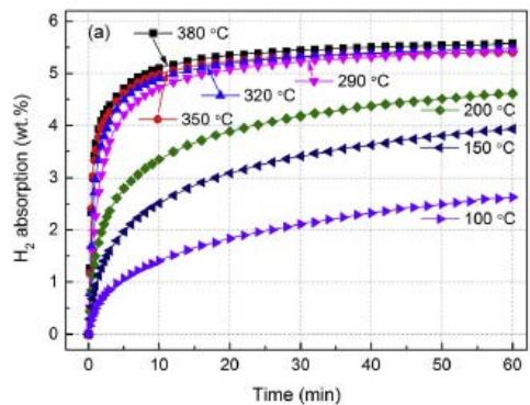The hydrogen absorption and desorption kinetics curves of $\mathrm{Mg_{88}Y_{12}}$ alloy obtained by Yang Yuan and Bu et al. [13] are shown in Fig. 10 (a) and (b), respectively. As can be seen from figure 10 (a), the sample with temperature $\geq 290^{\circ}\mathrm{C}$ shows a better kinetic curve, which is lower than $290^{\circ}\mathrm{C}$, showing poor kinetic function, but it can still absorb $2.63\mathrm{wt}\%$ and $3.94\mathrm{wt}\%$ hydrogen within 60 minutes under $100^{\circ}\mathrm{C}$ and $150^{\circ}\mathrm{C}$; the alloy shows good kinetics for hydrogen desorption at relatively high temperature, and the hydrogen energy under $380^{\circ}\mathrm{C}$ is completed within 10 minutes. But it is related to temperature and becomes very bad below $320^{\circ}\mathrm{C}$. As shown in figure 10 (b), $290^{\circ}\mathrm{C}$ is completely hydrogenated for about $400\mathrm{min}$.