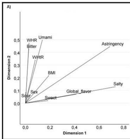 Finally, in quadrant 4, the variables BMI AA and WHtR AA are grouped, associated with the perception of the salty flavor at an excellent intensity and the astringent flavor at a regular intensity.