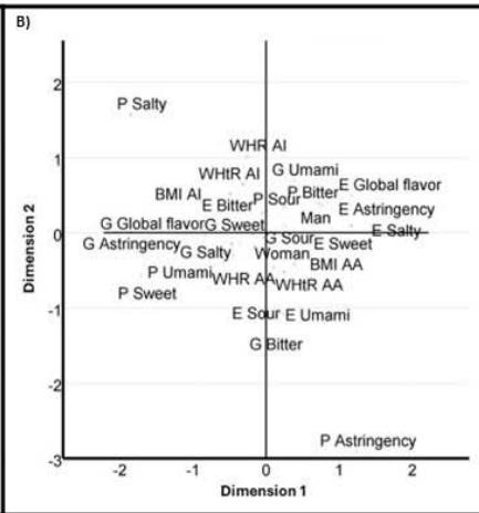Figure 2, section A, presents the multiple correspondence analysis for the flavor components and anthropometric indices. For dimension 1 (Table 2), a Cronbach's alpha value of 0.92 was obtained, with an eigenvalue of 9.43 and an inertia of 0.26. The main associated variables in this dimension are salty taste, sweet taste, astringency and overall perception in relation to sex. Regarding dimension 2, the Cronbach's alpha value was 0.91, with an eigenvalue of 8.85 and an inertia of 0.24. In this dimension, it was observed that all anthropometric indices (WHR, WHtR and BMI) showed a remarkable correspondence with the bitter, sour and umami taste variables.