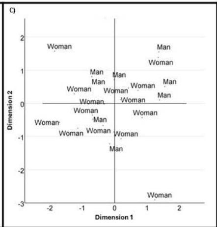 Section C of figure 3 shows the distribution of subjects according to sex. In this figure it can be observed that the highest concentration of men is found in quadrant 1, while women predominate in quadrant 3.