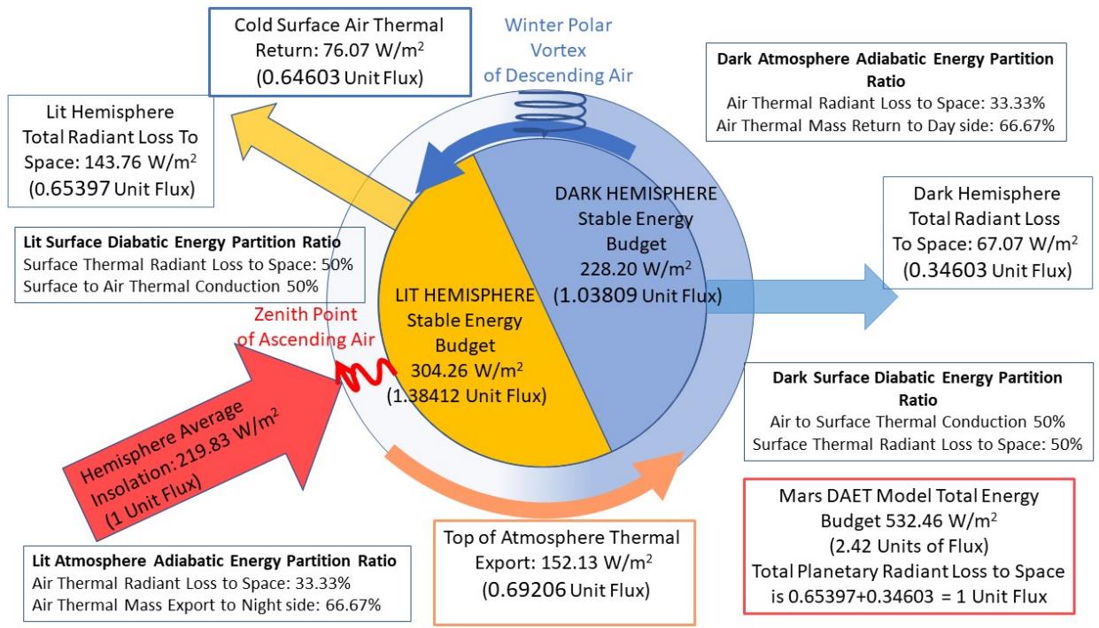 <table><tr><td>Lit Flow</td><td>C: Post-Albedo Solar Irradiance W/m2</td><td>Lit side Loss to Space from Solid Emitters (H+K)</td><td>Net Effective Litside Insolation (C-H-K)</td><td>Daytime Budget: Adiabatic Circulation of Net Insolation Times Two (Infinite Fractional Summation Loop)</td><td>Lit side Loss to Space from Atmospheric Emitters(L)</td><td>Total Lit side Loss to Space (H+K+L)</td><td>Nighttime Budget: Adiabatic Circulation of Net Insolation minus Litside Atmospheric Loss</td><td>Mars Gross Atmospheric Budget</td></tr><tr><td>Gains W/m2</td><td>219.83</td><td></td><td></td><td>304.27</td><td></td><td></td><td></td><td></td></tr><tr><td>Losses W/m2</td><td></td><td>67.69</td><td></td><td></td><td>76.07</td><td>143.76</td><td></td><td></td></tr><tr><td>Retention W/m2</td><td></td><td></td><td>152.13</td><td></td><td></td><td></td><td></td><td></td></tr><tr><td>Reservoir W/m2</td><td></td><td></td><td></td><td>304.27</td><td></td><td></td><td>228.20</td><td>532.47</td></tr><tr><td>Dark Flow</td><td>N: Net Advection to Nightside across the Dusk Terminator</td><td>Permanent Nighttime Reservoir Storage</td><td>O: Nighttime Bypass Window to Space from Advection Heated Surface</td><td>P: Reduced Dark Surface Flux after Atmospheric Window Loss</td><td>Q: Dark side Loss to Space from Atmospheric Emitters(N-P)</td><td>Total Dark side Loss to Space (O+Q)</td><td>R: Dark side Polar Atmosphere Thermal Retention (P-Q): Advects to Tropics across Dawn Terminator</td><td>Mars Gross Planetary Radiation Loss to Space (H+K+L+O+Q)</td></tr><tr><td>Gains W/m2</td><td>152.13</td><td></td><td></td><td></td><td></td><td></td><td></td><td></td></tr><tr><td>Losses W/m2</td><td></td><td></td><td>38.03</td><td></td><td>38.03</td><td>76.07</td><td></td><td>219.83</td></tr><tr><td>Retention W/m2</td><td></td><td>76.07</td><td></td><td>114.10</td><td></td><td></td><td>76.07</td><td></td></tr></table>