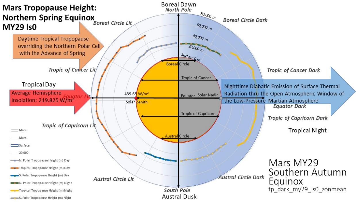 15. The structural form, seasonal variation, and physical height of the tropopause for both the Tropical and Polar cells is a manifestation of atmospheric circulation dynamics under daytime insolation forcing and dark surface radiative cooling (Figures 1, 2).