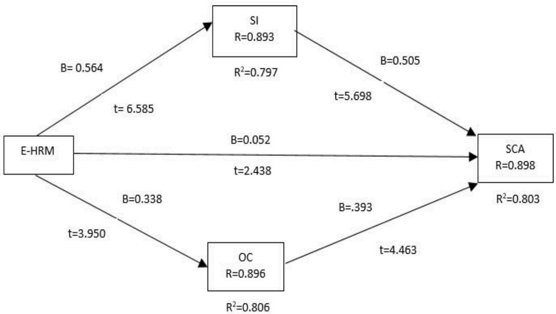 The hypothesis testing findings (figure 2) disclose that E-HRM have direct and positive impact on SCA ( $\beta = 0.052$, $t = 2.4308$ ). Thus, hypothesis 1 was acceptable. The results determine that E-HRM have positive influence on SI ( $\beta = 0.564$, $t = 6.585$ ) and OC ( $\beta = 0,338$, $t = 3.950$ ). Therefore, hypothesis 2 and 4 were both supported. Furthermore, SI and OC are both have a direct and positive impact on SCA ( $\beta = 0.505$, t = 5.698), ( $\beta = 0.393$, t = 4.463). Thus, hypothesis 3 and 5 was supported. In addition, figure 2 displays the E-HRM explains $80\%$ of the variance in SI ( $R^2 = 0.797$ ) and $81\%$ of the variance of OC ( $R^2 = 0.806$ ). Furthermore, E-HRM, SI, and OC explains $81\%$ of the variance pin SCA ( $R = 0.803$ ).