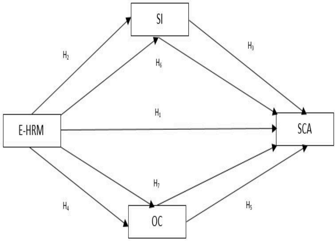 The theory of dynamic capabilities explains how the ability to form, renew, and restructure organizational resources to meet competitive market demands enhances an organization's adaptability to environmental changes. This adaptability is a key factor in achieving competitive advantage. This study examines how E-HRM influences SCA through the roles of SI and OC. It emphasizes the unique capabilities and mechanisms through which E-HRM practices enhance SI and OC to achieve SCA. From a theoretical standpoint, this study contributes to research by highlighting the specific roles of E-HRM practices in proactively developing employee competencies and capabilities to benefit the organization.