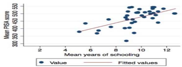 Les résultats de l'éducation sont généralement mesurés en termes de « quantité » (nombre d'années de scolarité) et de « qualité » (résultats d'apprentissage). La figure 1 ci-dessus présente trois diagrammes de dispersion utilisant les données de 2010 pour montrer la corrélation entre (i) les dépenses d'éducation (en part du PIB), (ii) les années moyennes de scolarisation et (iii) les résultats des tests du Programme international pour le suivi des acquis des élèves (PISA). Au niveau transversal, les dépenses d'éducation sont corrélées positivement avec les mesures de la quantité et de la qualité. Par la suite, elles sont reliées positivement entre elles. Ainsi, on conclut que les pays qui consacrent davantage de ressources publiques à l'éducation