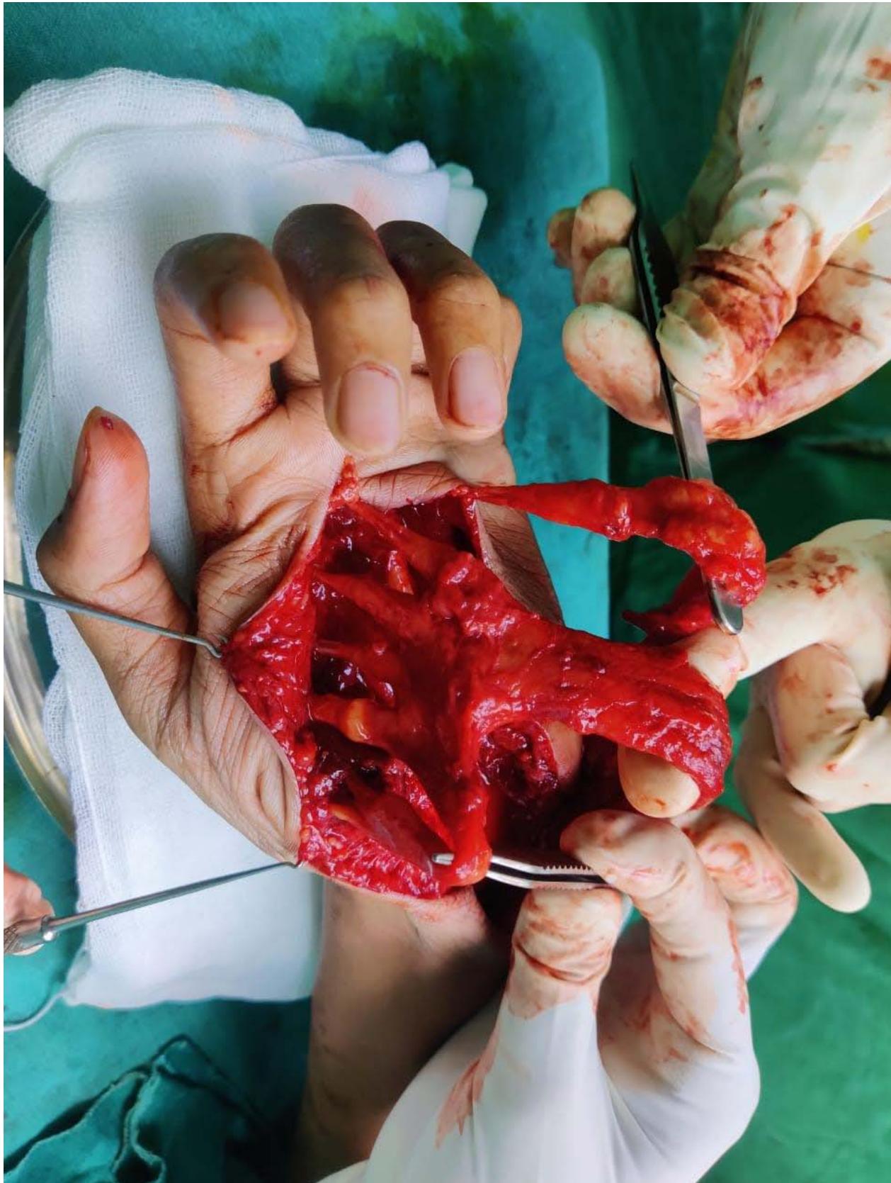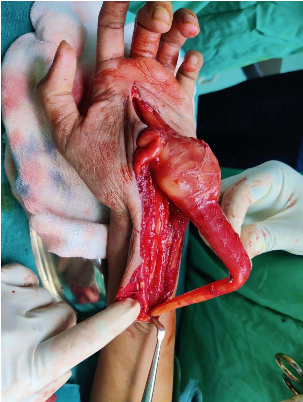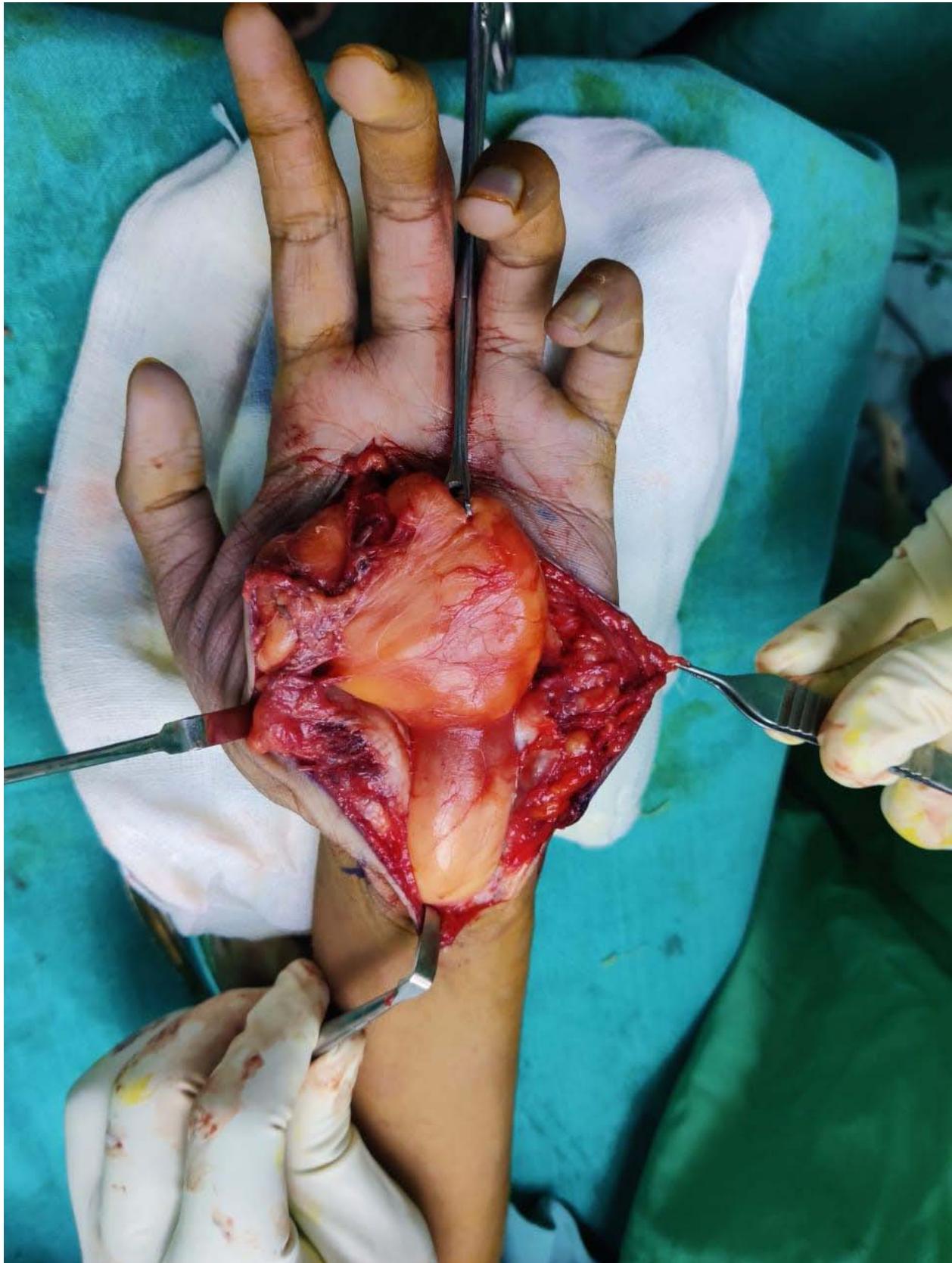 Figure 4: Intraoperative image of the Lipofibromatous Hamartoma in the palm of Left hand