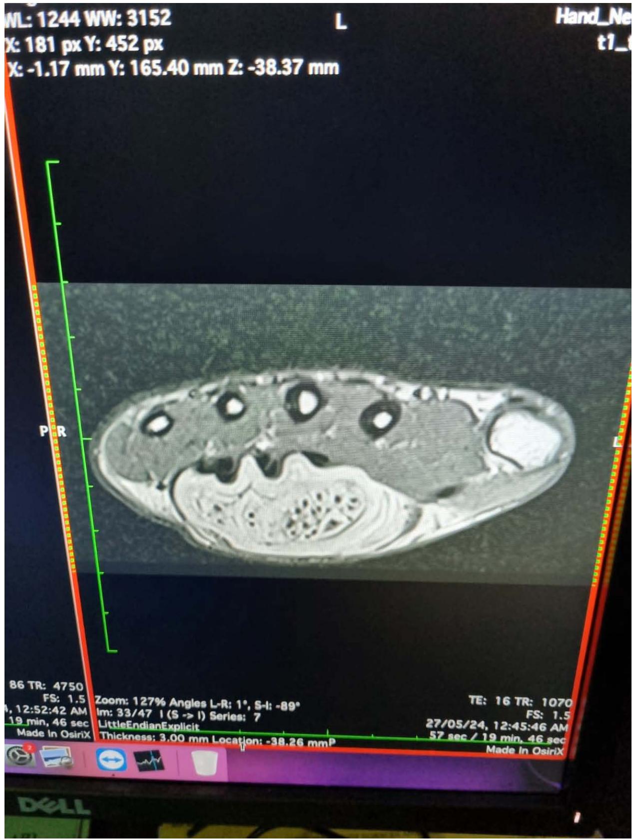 On physical examination, a smooth, partially mobile, fusiform-shaped, non-tender swelling, soft in consistency measuring approximately $10 \times 10 \mathrm{~cm}$ was observed over the volar aspect of the left wrist region and over the left palm, with no associated skin changes. Sensations was intact to light touch. The two point discrimination over the radial three digits was $5 \mathrm{~mm}$ and was normal in the rest. The movements at all joints were normal, mild restriction secondary to the mass over the palm. The rest of the physical examination was unremarkable.