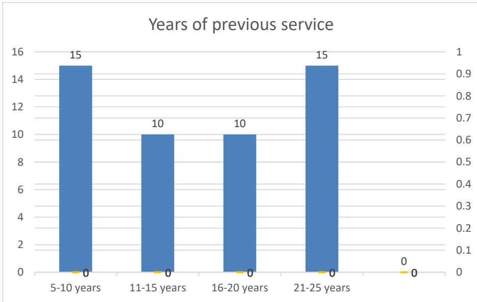 Regarding the years of previous service in the general school, we can find that from 5-10 years the percentage is $30\%$, from 11-15 years the percentage is