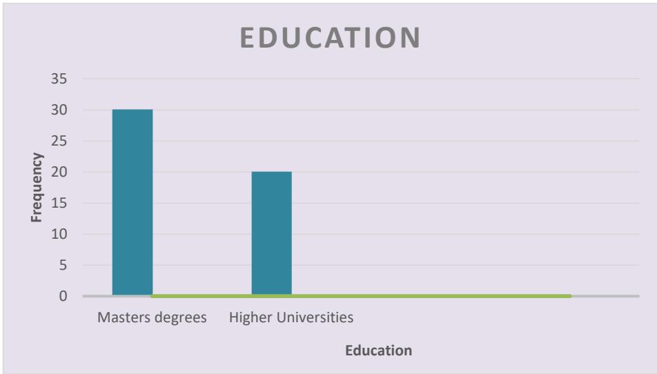 <table><tr><td colspan="2"></td><td>Frequency</td><td>Percent</td><td>Valid Percent</td><td>Cumulative Percent</td></tr><tr><td rowspan="3">Valid</td><td>Masters Degrees</td><td>30</td><td>60,0</td><td>60,0</td><td>60,0</td></tr><tr><td>Higher Universities</td><td>20</td><td>40,0</td><td>40,0</td><td>100,0</td></tr><tr><td>Total</td><td>50</td><td>100,0</td><td>100,0</td><td></td></tr></table>