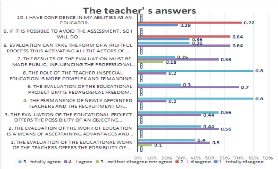 To the question 2 « The evaluation of the work of education is a means of ascertaining advantages and disadvantages of the educational system », most of the teachers in the sample at $56\%$ agree, 22 teachers with $44\%$ totally agree. There is no answer to the neither disagree nor agree, totally disagree and I disagree (percentage $0\%$ ).