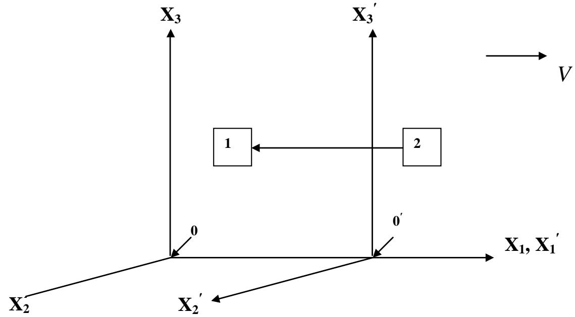 Fig.1: $X_{1}, X_{2}, X_{3}$ and $X_{1}^{\prime}, X_{2}^{\prime}, X_{3}^{\prime}$ are the laboratory reference frame and that moving uniformly and rectilinearly with the velocity v. 1 is the observer at rest; 2 is the radiating black body