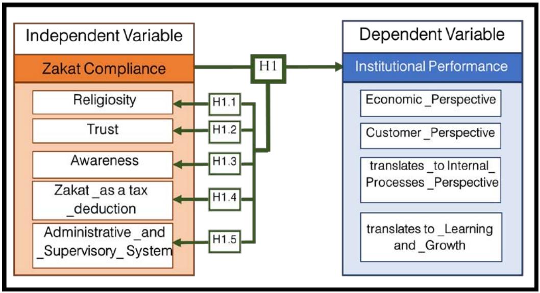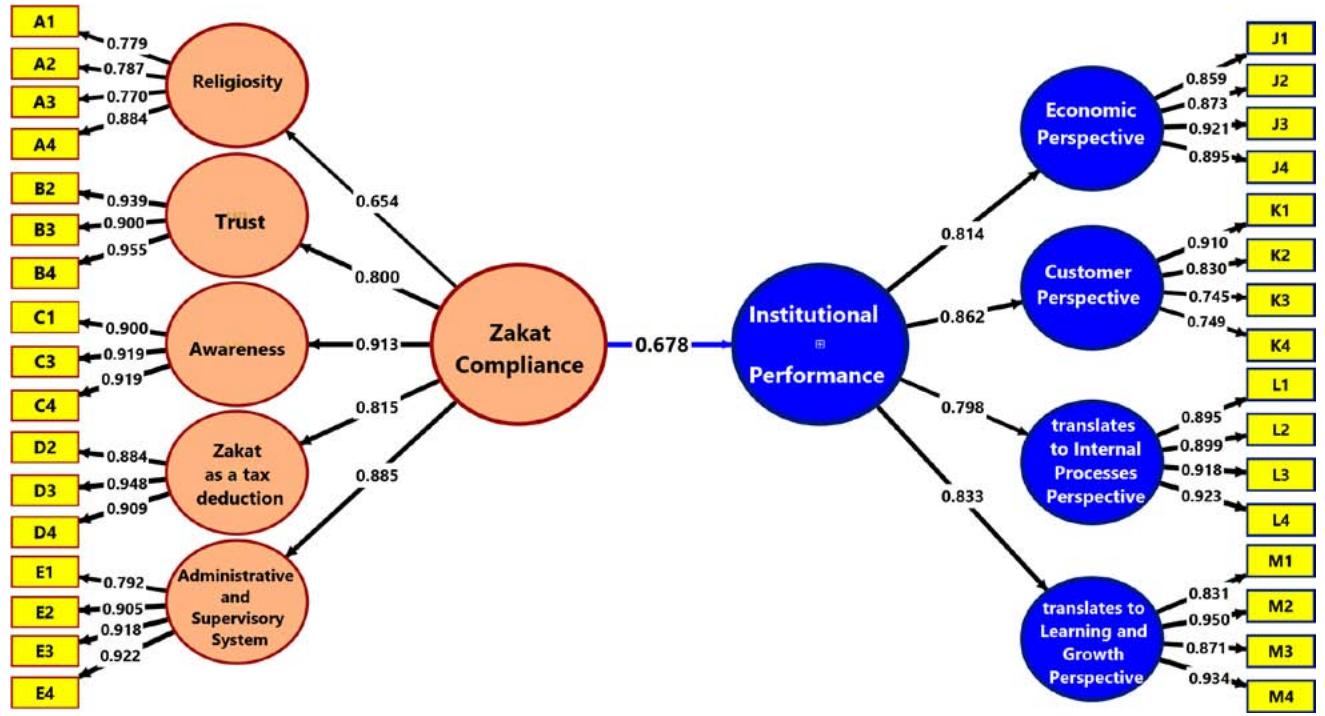This study examined the causal impact of zakat compliance on the institutional performance of Yemen’s General Authority for Zakat. It employs a novel integrated theoretical framework that combines the Theory of Planned Behavior, Social Exchange Theory, and Organizational Legitimacy Theory-a comprehensive approach not previously applied in the context of zakat institutions with this level of comprehensiveness. A quantitative research design was adopted, and data were collected from 398 managerial staff members using a validated electronic questionnaire. The relationships among five dimensions of zakat compliancereligiosity, trust, awareness, zakat as a tax deduction, and the administrative and regulatory system-were examined using Partial Least Squares Structural Equation Modeling (PLS-SEM). The findings reveal that zakat compliance has a substantial effect on institutional performance, explaining 90.8% of its variance (R² = 0.908).