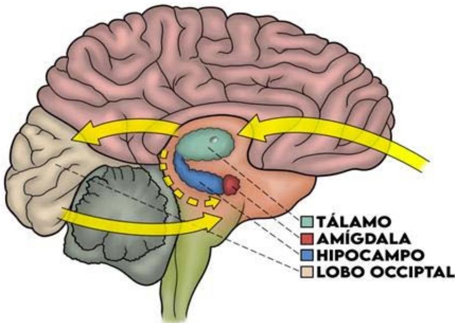 Sendo, o estímulo, uma vez recebida pelo tálamo, um fluxo rápido e sem filtro da informação é transmitido a amígdala, que busca identificar se existe algum tipo de ameaça, para uma ação de resposta rápida, desencadeando reações emocionais e comportamentais imediatas e vigorosas. De forma simultânea, um fluxo maiorda informação é enviado ao córtex pré-frontal, onde a informação é processada e mais bem avaliada. No caso de um estímulo visual, ele é enviado para o lobo occipital (figura 1). Em seguida, uma comunicação mais precisa é feita novamente a amígdala (LeDoux, 1986a, 1991b, 1992c).